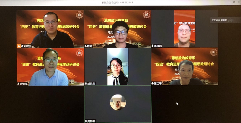 “四史”教育进课堂暨课程思政研讨会于2020年6月20日晚19:30在腾讯会议平台召开,学院教学院长赵银亮老师、思政系系主任刘建良老师、思政系的各位教师和学院教务主管龚影寒老师参加了本次研讨会。