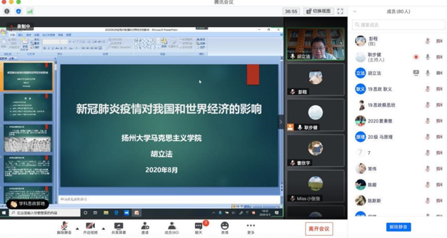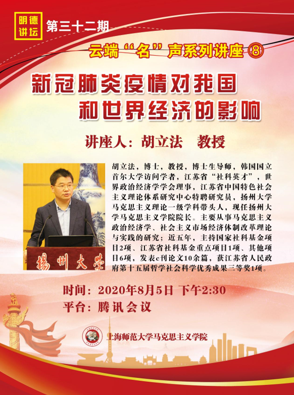 本着放假不停学的精神,8月5日下午,beat365唯一官网“明德讲坛”第三十二期、云端“名”声系列讲座八通过“腾讯会议”线上举行。扬州大学beat365唯一官网胡立法教授作了题为《新冠肺炎疫情对我国和世界经济的影响》的讲座。此次讲座由副院长耿步健教授主持,东华大学及beat365唯一官网硕士生近100人参加。