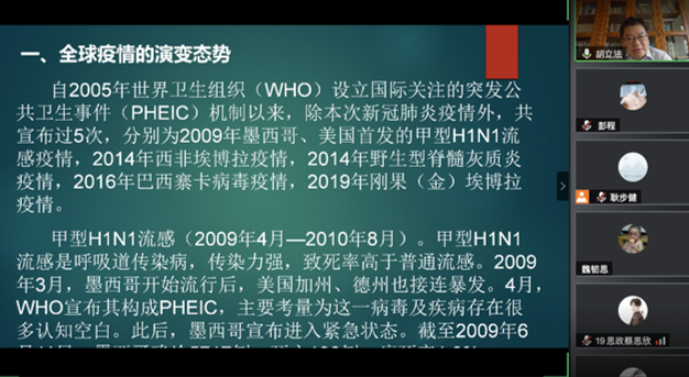 胡立法教授从五个方面对新冠肺炎疫情对我国和世界经济的影响进行了解读。第一,通过中国、海外新增确诊趋势图、重点疫情国家累计确诊趋势图、各国疫情严重指数排行表等,为同学们分析了全球疫情的演变态势;第二,从疫情冲击下全球及主要经济体GDP增速的预测、疫情全球蔓延对全球产业的影响等方面,帮助同学们理解把握疫情对全球经济影响;第三、从疫情全球蔓延对中国宏观经济的影响、对中国产业的影响等方面,帮助同学们充分认识疫情全球蔓延对中国经济的影响;第四、从国际疫情蔓延下我国宏观和监督政策面临保增长和优化结构的双重挑战、疫情全球蔓延给我国产业及产业链带来的风险与机遇等方面,帮助同学们充分了解疫情全球蔓延定中国经济面临的风险、挑战和机遇;第五、从“财政政策更加积极有为,货币政策保持稳健并适度放松,监管政策保持连续性和灵活性,长期持续深化体制机制改革”“对受国际舆情蔓延影响的行业,采取不同的应对措施”“采取更加积极的措施应对疫情全球蔓延对供应链的影响”等方面,帮助同学们积极探寻疫情全球蔓延下中国经济的应对措施。
