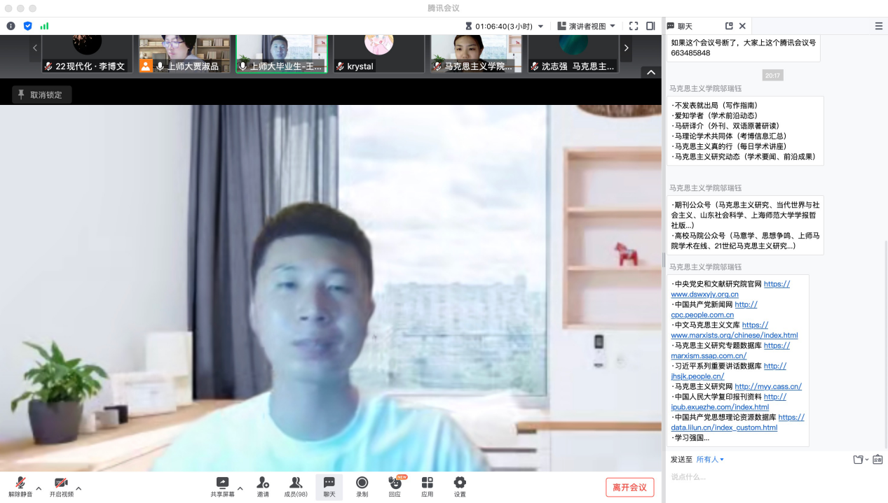 beat3652020级马克思主义基本原理专业硕士研究生邬瑞钰同学结合自身兴趣点和个人毕业论文写作的经验,向新生分享了关于论文选题、论文书写以及文章投稿等问题的具体要求和方法技巧。