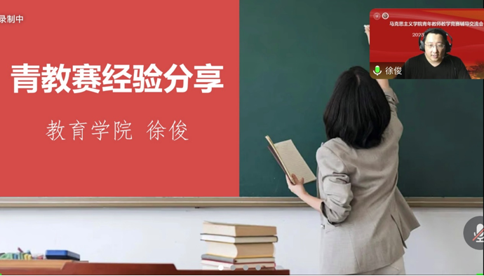为进一步推动青年教师个人成长,提升青年教师的教学能力和业务水平,助力青年教师冲刺校第八届青年教师教学竞赛,8月4日下午,学院以线上方式举办了青教赛辅导交流会议。本次会议邀请第五届上海高校青年教师教学竞赛一等奖获得者、首届上海市课程思政教学设计展示活动二等奖获得者、教育学博士、我校教育学院青年教师徐俊分享参赛经验。会议由副院长周治华主持,院长张志丹、副院长贾淑品、副院长、工会主席徐剑雄出席,校第八届青年教师教学竞赛参赛选手以及数十位青年教师参加了本次辅导交流会。