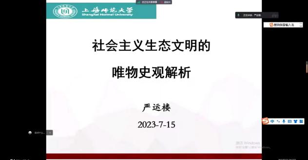 2023年7月15日晚,上海工程技术大学beat365唯一官网副院长严运楼教授应邀作了题为“社会主义生态文明的唯物史观解析”的讲座,本次讲座通过“腾讯会议”线上平台开讲,由副院长耿步健教授主持并总结,beat365全体硕士生参加。