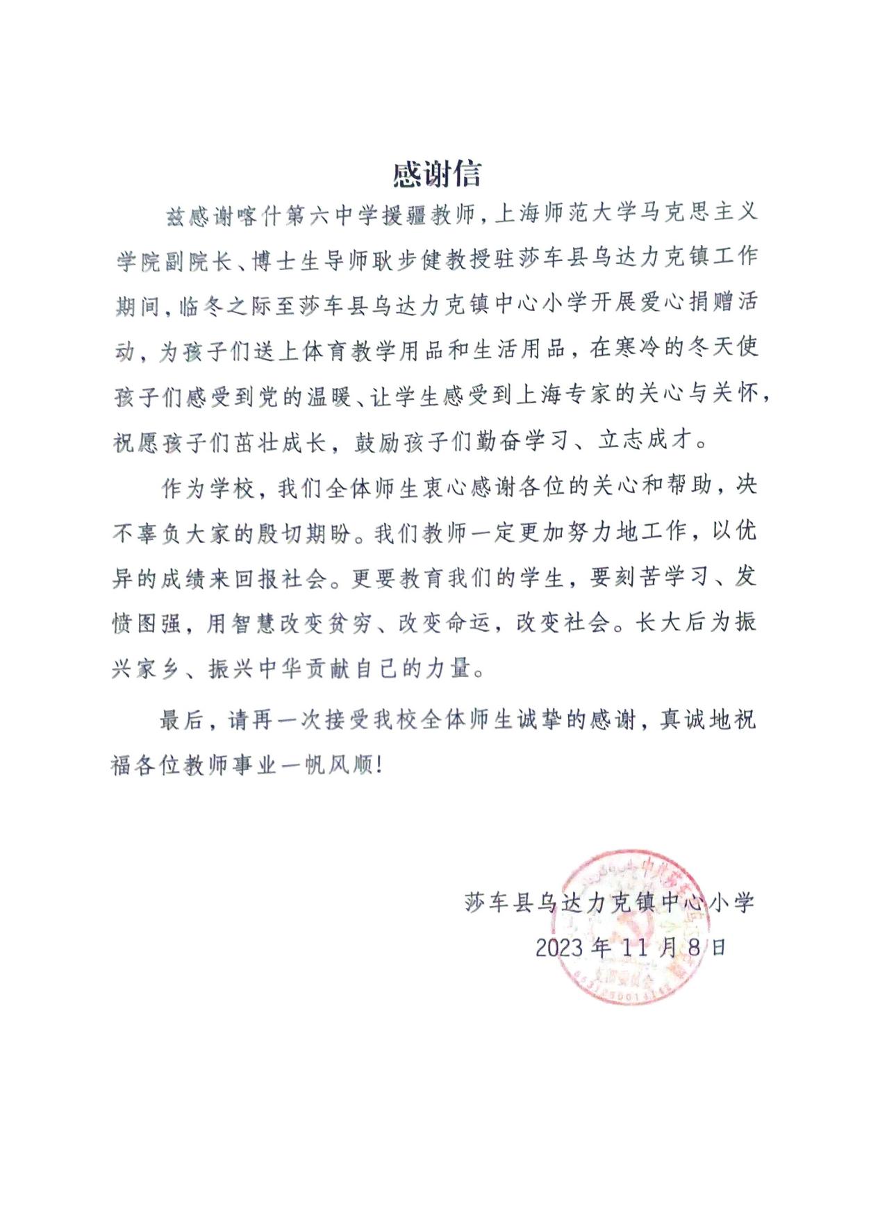 2023年11月6日,beat365唯一官网附属喀什实验中学(喀什第六中学)援疆教师、beat365唯一官网副院长耿步健教授,在beat365唯一官网附属喀什实验中学(喀什第六中学)副校长王仁正的带领下,赴乌达力克镇琼艾日克村(乌达力克镇24村)考察并进行慰问活动,了解琼艾日克村脱贫攻坚伟大成就及其背后的感人故事、党的惠民利民政策及铸牢中华民族共同体意识方面的生动事例等,以此丰富学校思政课教学内容,不断引导学生感党恩、听党话、跟党走,不断铸牢中华民族共同体意识。