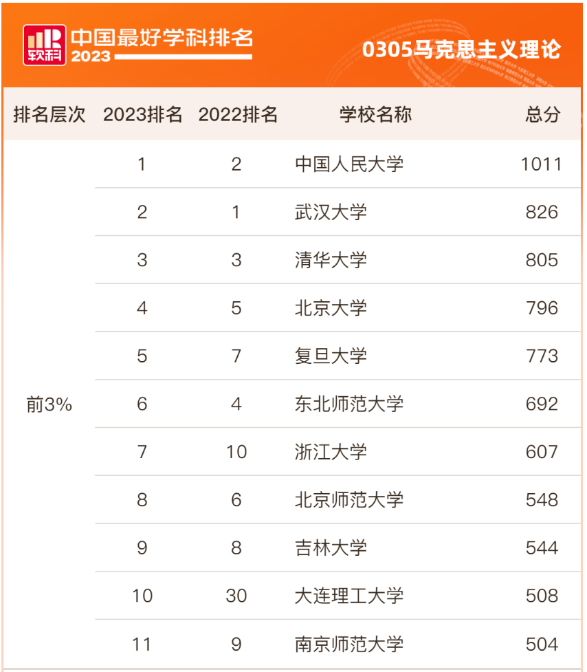 经过研究相关数据知悉,上海师大马克思主义理论学科软科排名,近年来呈现逐年上升的势头,由2017年软科排名第153名,到2023年第35名。根据今年的数据可知,在马学科软科排名高校共有388所,上海师大马学科排名已进入前9%。