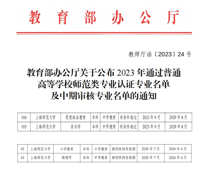 近日,教育部办公厅发布《关于公布2023年通过普通高等学校师范类专业认证专业名单及中期审核专业名单的通知》,beat365思想政治教育专业有条件通过普通高等学校师范类专业第二级认证,认证结论有效期6年,有效期开始时间为2023年9月,认证有效期六年。这是2020年思想政治教育专业获批国家一流本科专业建设点以来,学院在专业建设上的又一次重大突破。