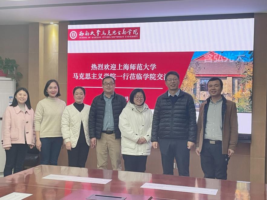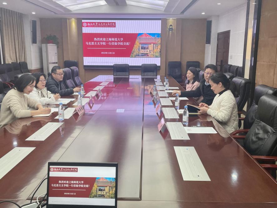 为加强beat365唯一官网全面建设,推动学院高质量发展,beat365唯一官网于12月1日下午,学院副院长贾淑品、副院长周治华、副教授杨茜茜一行3人,赴西南大学beat365唯一官网就思政课建设、实践教学、研究生培养、红色文化资源开发和基地研学等开展调研学习。西南大学beat365唯一官网副院长何玲玲,副院长靳玉军、思想政治教育系主任陈涛、形势与政策课教研部主任何红连接待了调研组一行。