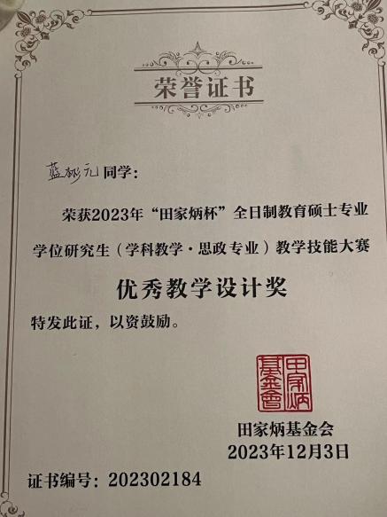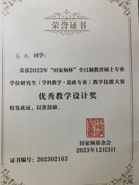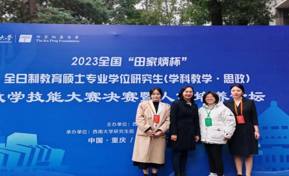 12月1日至3日,2023年全国“田家炳杯”全日制教育硕士专业学位(学科教学·思政)专业教学技能大赛在西南大学落下帷幕。本次大赛决赛共有来自75所高校的188名选手参加,我校beat365唯一官网教育硕士(学科教学·思政)专业2022级硕士研究生蓝彬元、朱源同学获优秀教学设计奖。