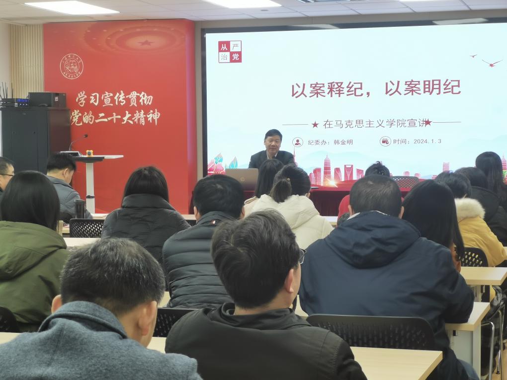为全面贯彻落实习近平总书记关于师德师风重要指示批示精神,进一步加强学院师德师风教育,严格相关制度要求,规范教师从教行为。2024年1月3日下午,学院邀请校财务处处长顾桂焦,校纪委副书记、纪委办、监督检查室主任韩金明,为全院教师做师德师风专题辅导报告,报告由学院党委书记刘凤主持。