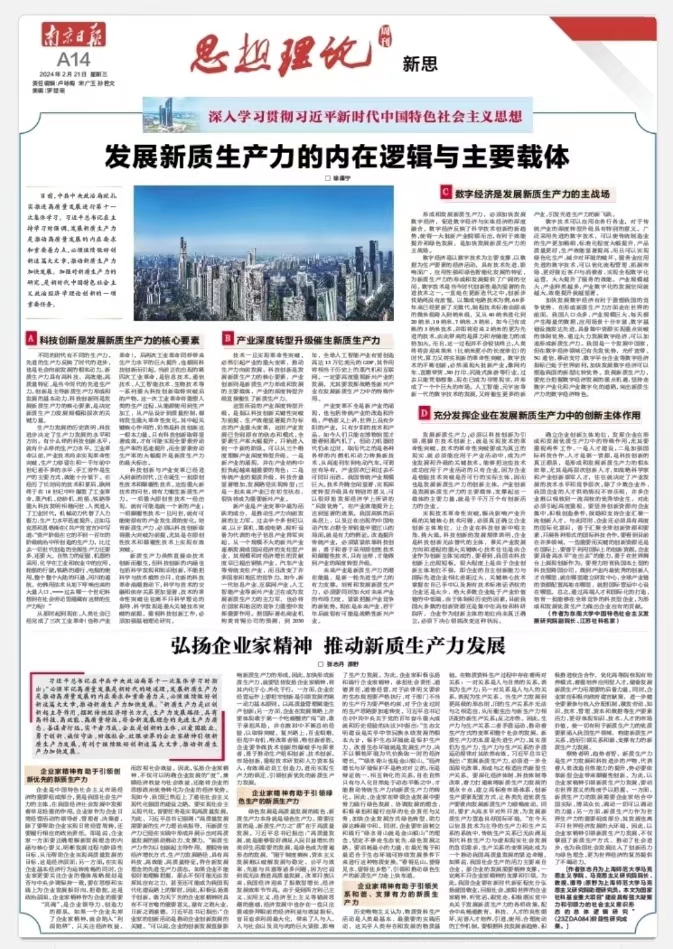 习近平总书记在中共中央政治局第十一次集体学习时指出:“必须牢记高质量发展是新时代的硬道理,发展新质生产力是推动高质量发展的内在要求和重要着力点,必须继续做好创新这篇大文章,推动新质生产力加快发展。”新质生产力是以创新起主导作用,摆脱传统经济增长方式、生产力发展路径,具有高科技、高效能、高质量特征,符合新发展理念的先进生产力质态。善谋者行远,实干者乃成。企业是创新的主体,以爱国敬业、勇于创新、诚信守法、回报社会、放眼世界的企业家精神引领新质生产力发展,有利于继续做好创新这篇大文章,推动新质生产力加快发展。