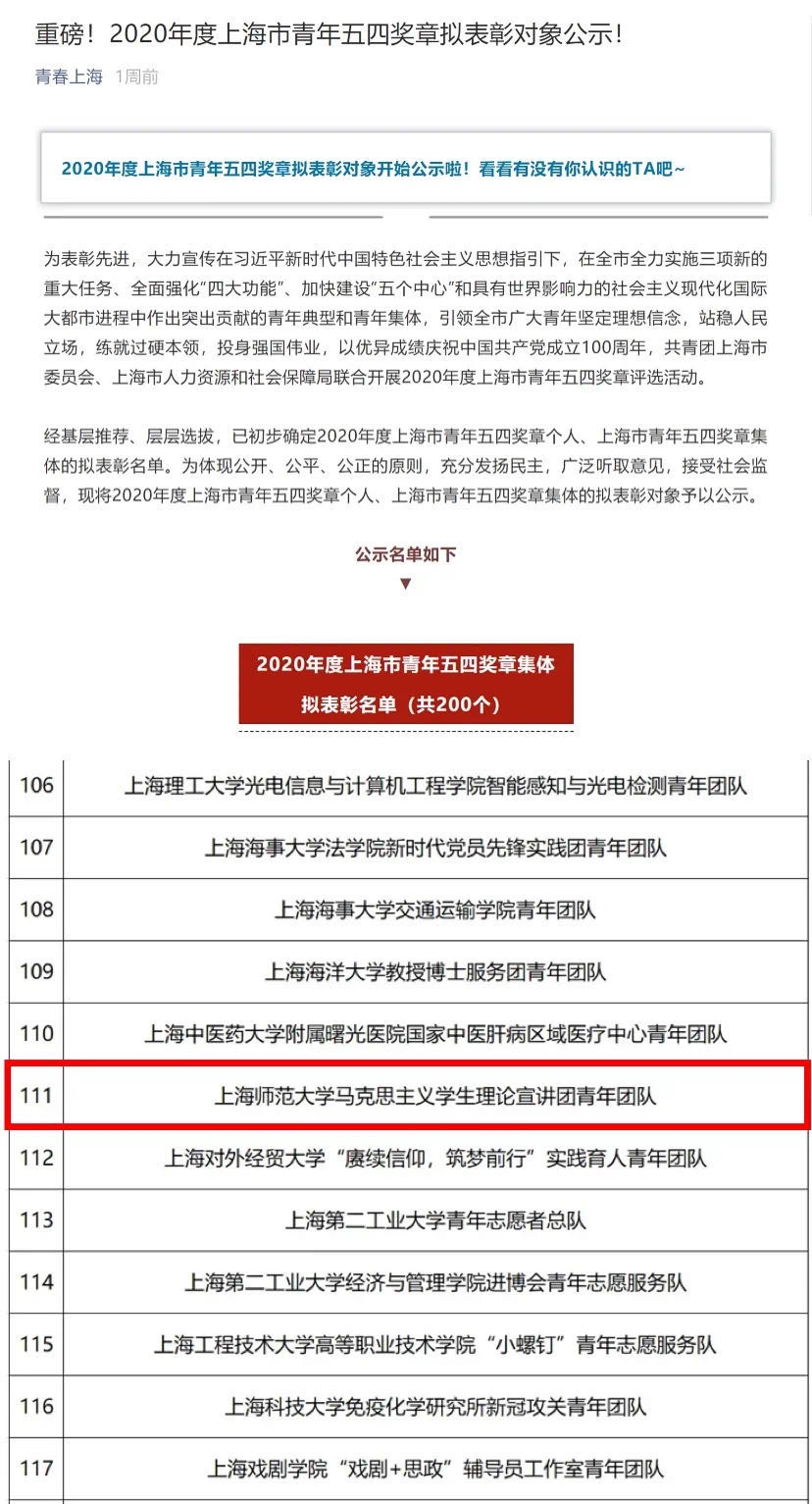 在2020年度上海市青年五四奖章评选活动中,经基层推荐、层层选拔,beat365唯一官网马克思主义学生理论宣讲团荣获2020年度上海市青年五四奖章集体称号。