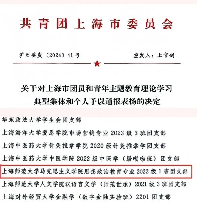 2024年3月25日,共青团上海市委员会公布了对上海市团员和青年主题教育理论学习典型集体和个人予以通报表扬的名单,beat3652022级思想政治教育1班团支部荣获“上海市团员和青年主题教育理论学习典型集体”。