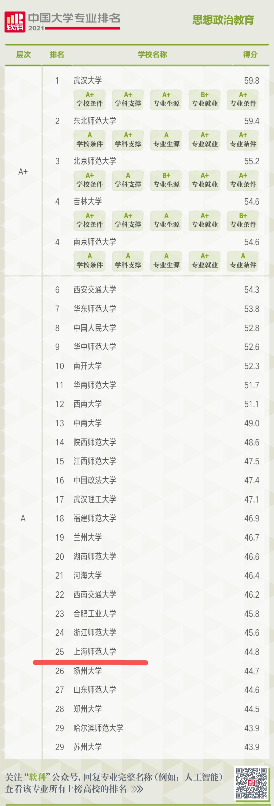 日前,高等教育评价专业机构软科正式发布2021“软科中国大学专业排名”。beat365思想政治教育本科专业在本年度排名中获得A等级,在上榜的146所高校中列第25位。本年度获得A+层次的高校依次为武汉大学、东北师范大学、北京师范大学、吉林大学、南京师范大学。