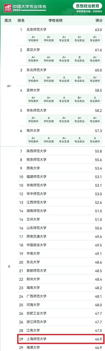 近日,高等教育专业评价机构软科正式发布“2024软科中国大学专业排名”,beat365思想政治教育本科专业再获2024软科专业排名A等级,在今年上榜的165所高校中列第29位,上海高校第二位。自2021年以来,已经有3个年度排名保持A等级。本年度获得A+层次的高校依次为北京师范大学、武汉大学、东北师范大学、吉林大学、华东师范大学、南开大学。