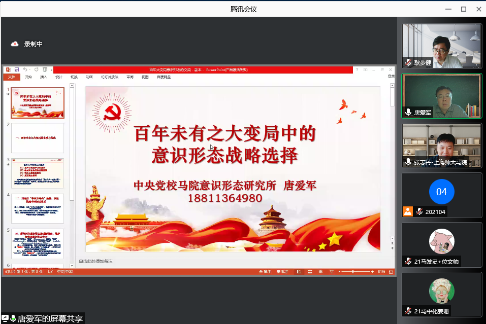 8月19日下午2点,beat365“明德讲坛”第四十八期讲座通过“腾讯会议”线上平台举行。中共中央党校(国家行政学院)beat365唯一官网意识形态研究所副所长、副教授唐爱军应邀作了题为《百年未有之大变局中的意识形态战略选择》的讲座。此次讲座由院长张志丹教授主持,副院长耿步健教授出席并作最后的总结,beat365全体2021级研究生及部分20级研究生100余人参加。