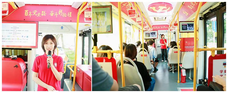 此外,马克思主义学生理论宣讲团成员坚持从思政小课堂走进社会大课堂,从社会大课堂中汲取养分,提升理论宣讲的时效性、科学性和趣味性。暑假期间,理论宣讲团成员王慧莲冒着37度高温参加志愿者培训,并完成近2万字的讲解稿背诵,顺利登上“百年党史路 奋斗新征程”党史学习教育红色巴士,成为红色巴士课堂的志愿讲解员。