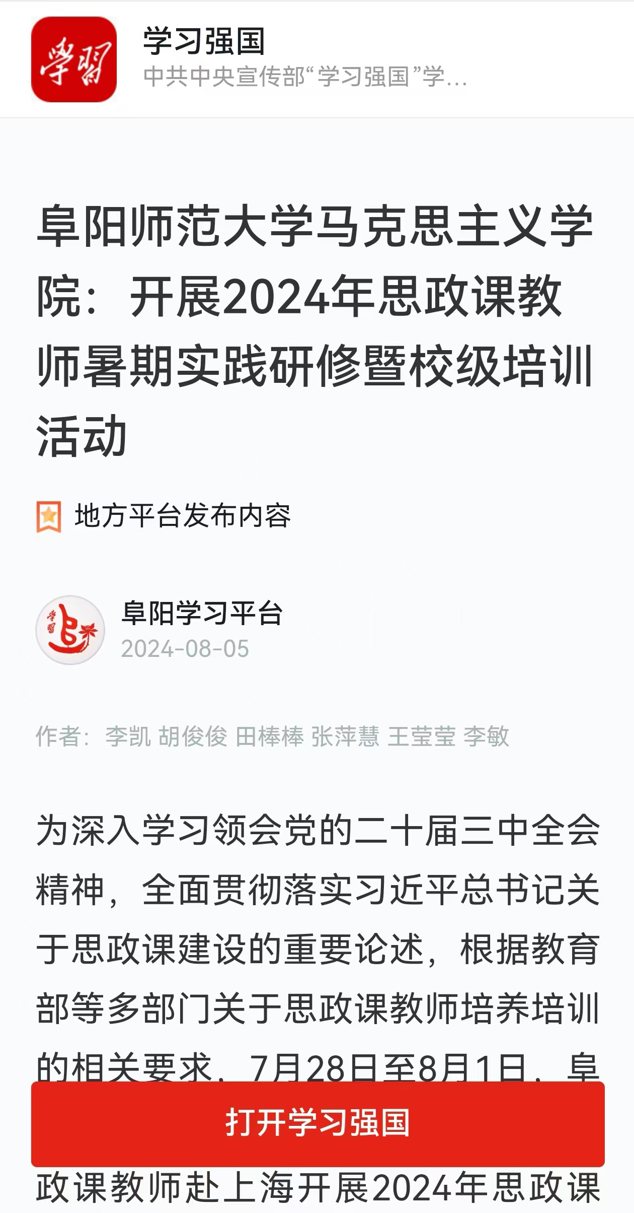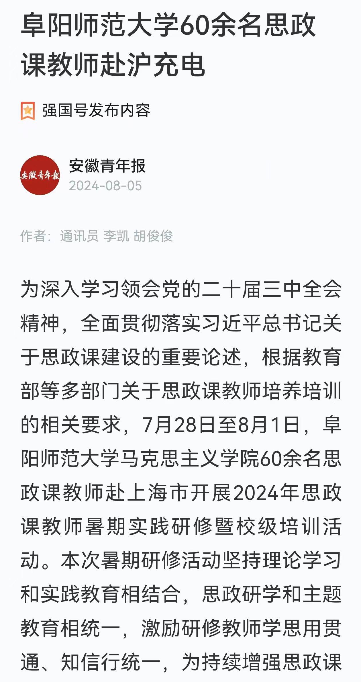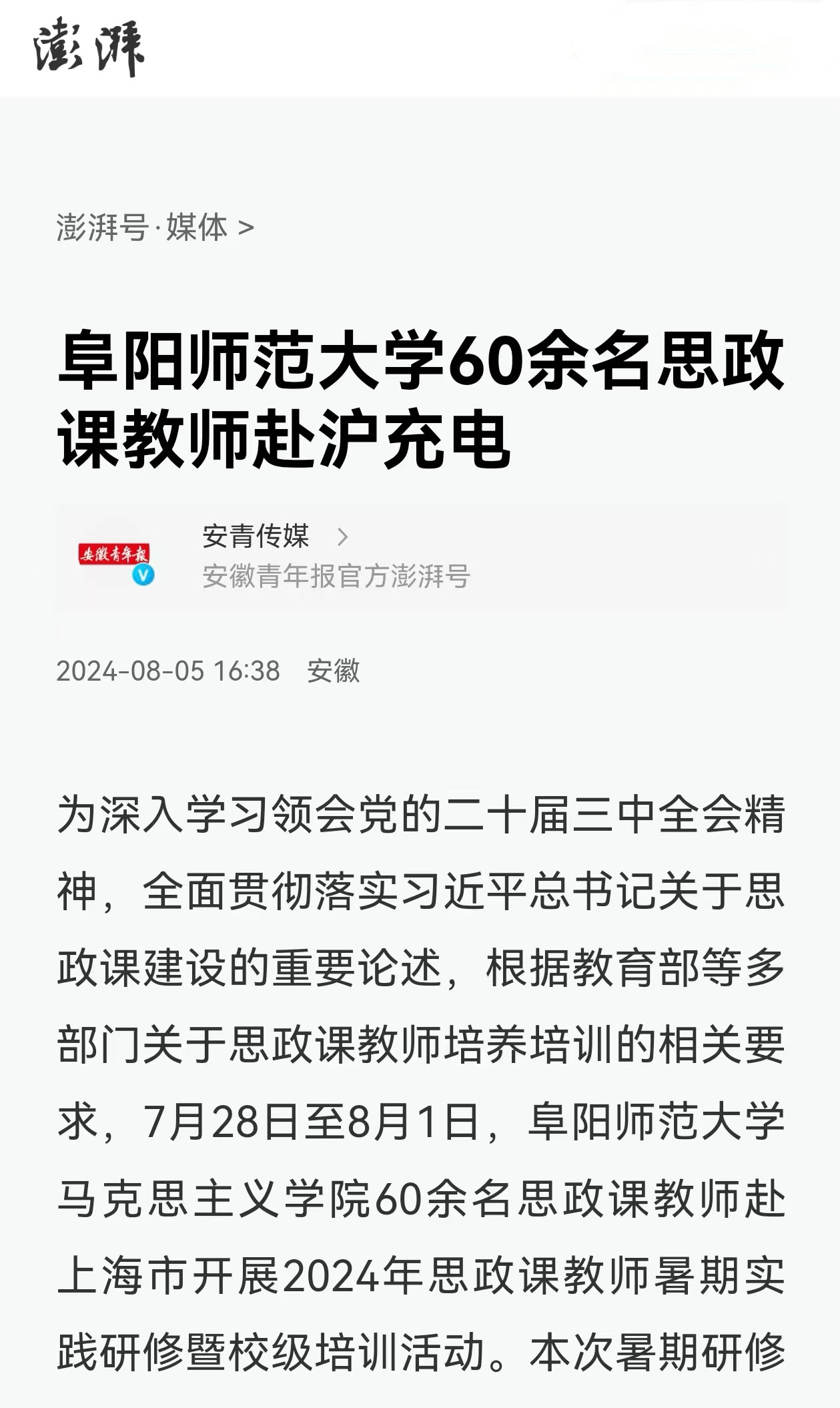 为深入学习领会党的二十届三中全会精神,全面贯彻落实习近平总书记关于思政课建设的重要论述,根据教育部等多部门关于思政课教师培养培训的相关要求,7月28日至8月1日,阜阳师范大学beat365唯一官网60余名思政课教师来到上海高校思想政治理论课教师研修基地(beat365唯一官网)开展2024年思政课教师暑期实践研修暨校级培训活动。这一活动圆满结束后,多家主流媒体予以报道。其中,学习强国以《阜阳师范大学beat365唯一官网:开展2024年思政课教师暑期实践研修暨校级培训活动》为题、安徽青年报、安青网、安徽青年报官方澎湃号以《阜阳师范大学60余名思政课教师赴沪充电》为题分别报道了阜阳师范大学思政课教师赴上师大研修的情况。报道称赞这次研修活动效果明显:“底蕴深厚的专题讲座夯实理论根基”、“鲜活生动的实践教学补足精神之钙”、“形式多样的思政教学助力社会服务”,作为承办方beat365唯一官网为研修提供了精选方案、高质量师资、全方位服务,保证了研修活动顺利开展、圆满收官。