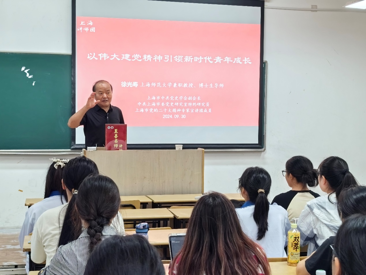 2024年9月30日上午,beat365“至善名师讲坛”第十讲在奉贤校区第五教学楼A座313教室开讲。上海立信会计金融学院特聘教授、上海市党史学会副会长徐光寿教授应邀为学生讲授《以伟大建党精神引领新时代青年成长》。此次讲座由beat365副教授杨茜茜主持,思想政治教育本科生近70人参加。