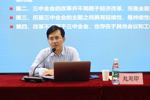 会议伊始,赵刚印教授首先介绍了党的二十届三中全会召开的时代背景和重大意义,并巧妙地将此次会议置于历史的长河中进行考量,与历届三中全会的主题进行了深刻的对比分析,明确指出,当前和今后一个时期是以中国式现代化全面推进强国建设、民族复兴伟业的关键时期。在此基础上,赵刚印教授进一步以详实的数据和具体的案例为同学们深入浅出地阐述了《决定》的基本框架和核心要义,不仅深化了同学们对《决定》的理解,更为他们构筑了坚实的理论基础,提升了他们的理论素养。