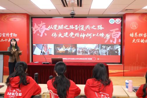 随后,2022级马克思主义学生理论宣讲团成员倪楠楠呈现了一场题为《从觉醒之路到复兴之路,伟大建党精神何以燎原》的金课展示。此课程分为“星火点点,蕴觉醒之路”“犹如火种,燃复兴之原”和“焮天铄地,续时代之光”三个部分。她通过生动的讲述向在场的“后浪”们传递着精心筹备的课程精髓。在课程的尾声,她还向加入2024级宣讲团的新成员们分享了关于宣讲选题与内容构思的宝贵经验与建议,旨在助力他们在新时代的宣讲舞台上绽放光彩。