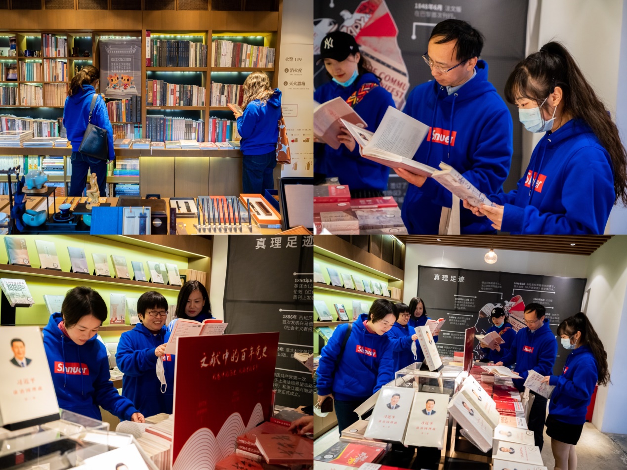 青年教师们还一同游览了集具徽派建筑特色的书院——朵云书院。它是由保存完好的“明代高房”整体搬迁而来,这里除了传统书店皆有的书籍外,还能看到和松江人文历史有关的线装古籍,特别在“文献中的百年党史”板块,青年教师们手捧党史各类书籍,认真翻阅,共享书香,一起感受党的百年历史。