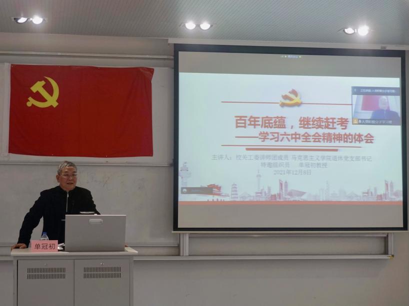 校关工委讲师团成员、beat365唯一官网退休党支部书记、特邀组织员单冠初教授向学员们讲授了主题为《百年底蕴,继续赶考——学习六中全会精神的体会》的专题党课。单老师以问题“中国共产党经过百年的奋战后,在当今的历史条件下为什么产生新的《决议》”引入党课内容,并通过详实的史料为同学们进行了解读,指出以史为鉴、开拓未来是我党的优良传统,随后,单老师带领同学们对《决议》文本的总体框架进行梳理,鼓励同学们在课后继续学习十九届六中全会精神。