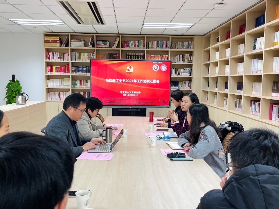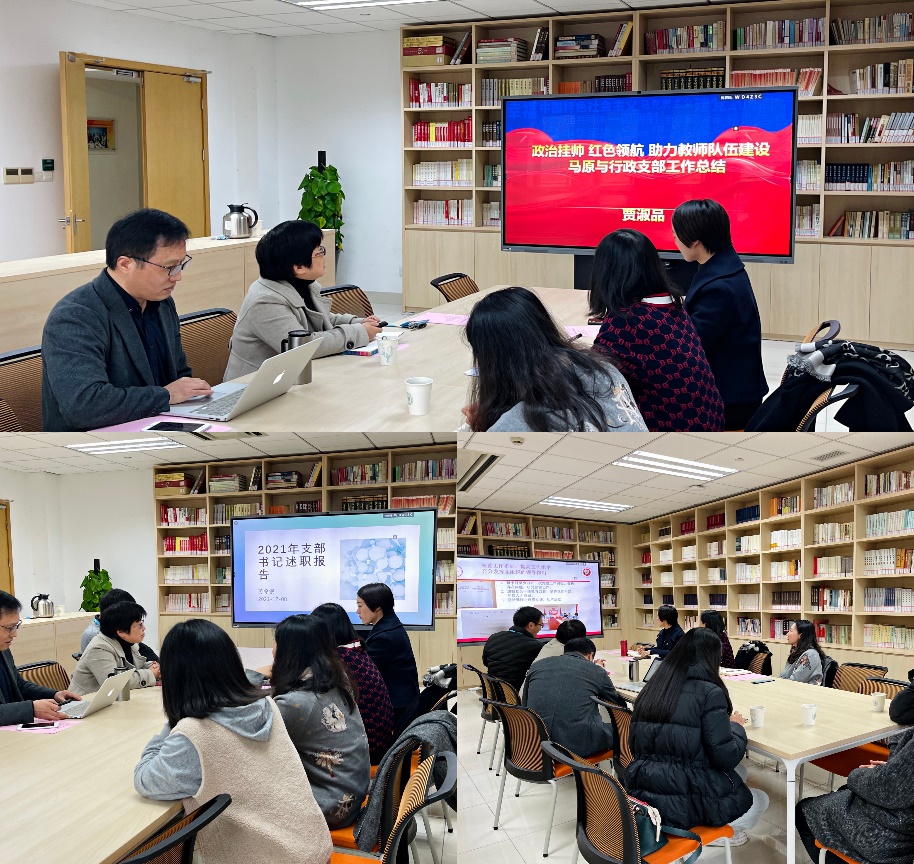 各教工支部书记分别就本支部的支部建设、党员情况、主题党日、未来规划等方面进行年度工作述职报告。首先,马基与行政联合党支部书记贾淑品分别从党员理论学习、青年教师的作用发挥、红色社会实践三方面进行工作总结,围绕支部成员的理论学习、支部特色活动及活动成效,通过照片生动地展示了支部党员教师岗位创建以及我为群众办实事的情况,并就如何引领青年教师处理好教学与科研关系发表了自己的想法;随后,马中化与近现代史联合党支部书记徐剑雄从支部工作机制、党内政治生活、党员教师思想政治引领三个方面进行汇报,同时也交流了该支部在开展“组织力提升”项目上的情况,如何通过党建引领发挥支部党员的先锋模范作用。最后,思政思修联合党支部书记苏令银从支部工作成效、问题总结、未来规划三方面进行了述职汇报,通过展示支部成员“学党史与学习习近平总书记七一重要讲话精神相结合”专题生活会和“学习党的十九届六中全会精神”等主题党日,交流了如何将理论学习和自己的本职工作相紧密结合,以此推动本职工作与学院事业共同发展。
