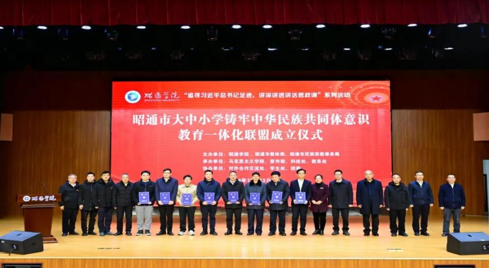 12月13日上午,昭通市大中小学铸牢中华民族共同体意识教育一体化联盟成立仪式在昭通学院韶华楼421报告厅成功举行,昭通市大中小学铸牢中华民族共同体意识教育一体化建设指导专家出席会议,昭通学院相关领导及来自全国各地的专家学者、教育工作者、学生代表等齐聚一堂,共同见证这一重要时刻,昭通学院党委副书记陈永华主持联盟成立仪式。