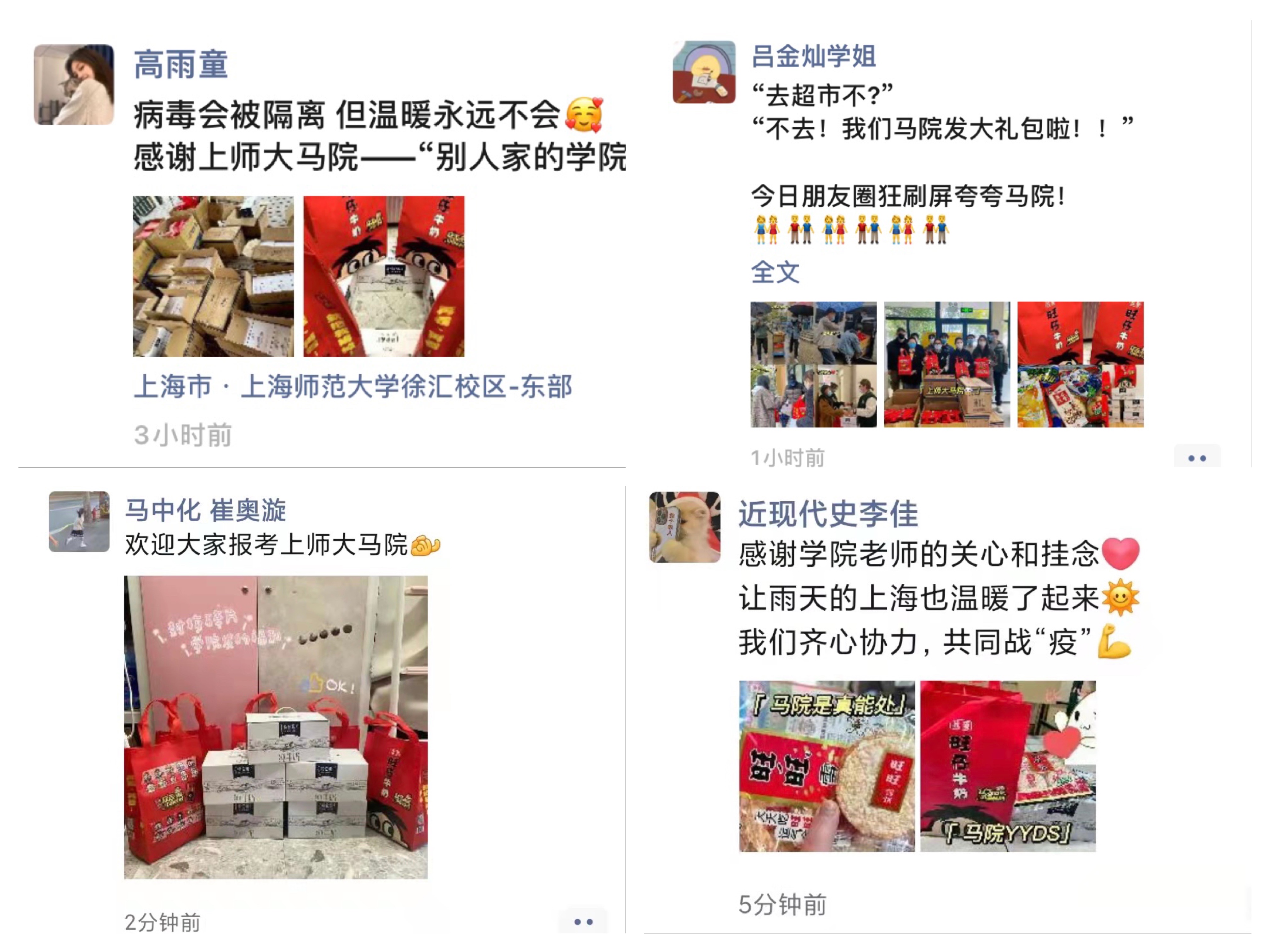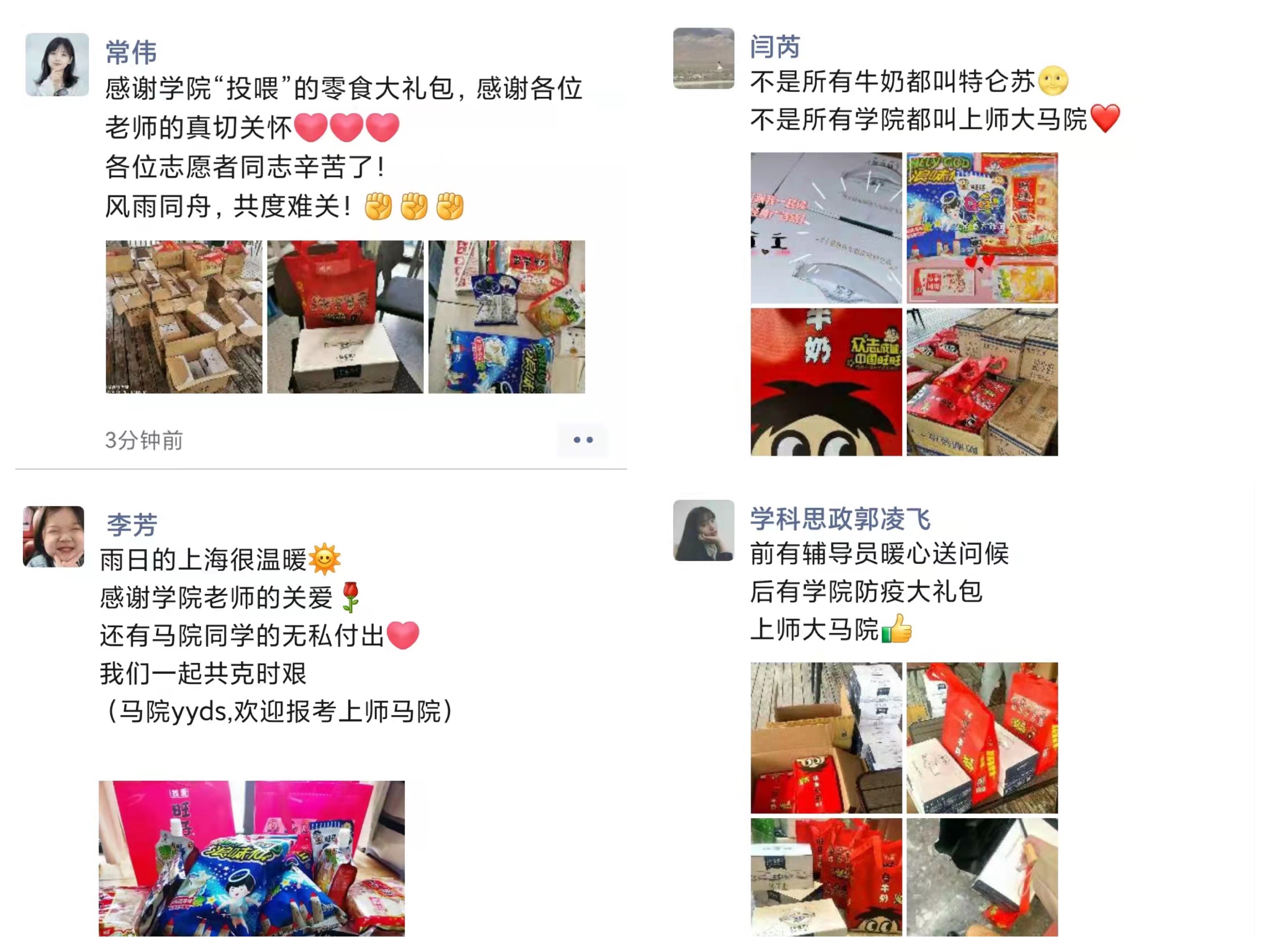 徐汇校区东部的疫情防控志愿者们清点物资并将其运送到指定地点,同学们先后来到派发现场,有序领取爱心礼包。收到零食大礼包后的同学们脸上洋溢着笑容,为学院带来的温暖而欣喜感动,并表示会继续严格遵守各项防疫管理规定,积极配合学院疫情防控工作的开展。西部校区的学生骨干同志愿者们一起走进宿舍为马院学子分发牛奶和零食大礼包,真正做到了“隔离病毒不隔离爱”。与此同时,奉贤校区的送温暖活动也在积极进行着,大雨虽至,热情不减,冷清的校园变得不再孤单。活动结束后,收到了来自同学们的热情反馈,大家都深深感受到了来自学院的爱与关怀。