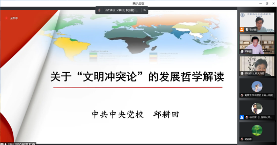 邱耕田教授以塞缪尔·亨廷顿的《文明的冲突与世界秩序的重建》一书为载体,围绕“从福山的历史终结论谈起”“不是文明的冲突,而是发展模式的博弈”“权力=发展力”“‘文化认同’?‘利益认同'!”“以习近平文明观看待人类文明的交流和发展”等方面深入解读了文明冲突论的发展哲学。
