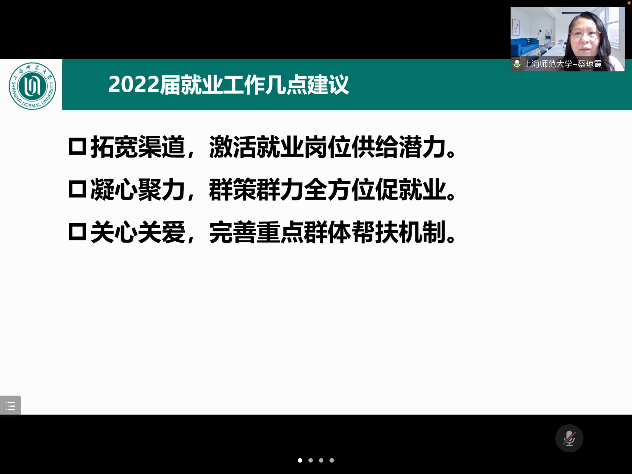 校学生职业发展与就业指导中心主任蔡琼霞老师通过数据重点就beat3652022届毕业生就业情况进行了介绍,并就当前遇到的就业结构性矛盾、经济下行压力以及毕业生求稳心态加剧等难题进行了剖析。最后,她建议通过拓宽渠道,激活就业岗位供给潜力,群策群力全方位促就业,完善重点群体帮扶机制等方式助力2022届毕业生顺利就业。