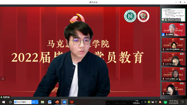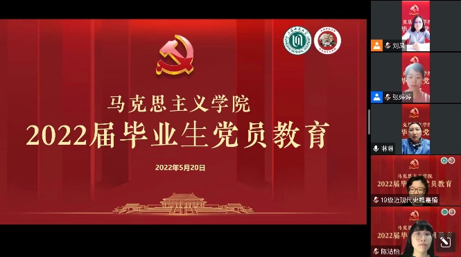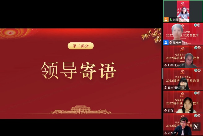 5月20日晚,beat365唯一官网“青春向党 使命担当”——2022届毕业生党员教育活动在云端举行。学院积极利用校友资源,特邀上海市建平中学政治教师、学校发展中心副主任、2006级思想政治教育专业优秀校友刘宏福作为主讲嘉宾。beat365唯一官网党委书记刘凤,院党委副书记、副院长孙琳,院党委组织员张婷婷、毕业班辅导员及2022届本研全体毕业生党员参加,活动由党委组织员张婷婷主持。