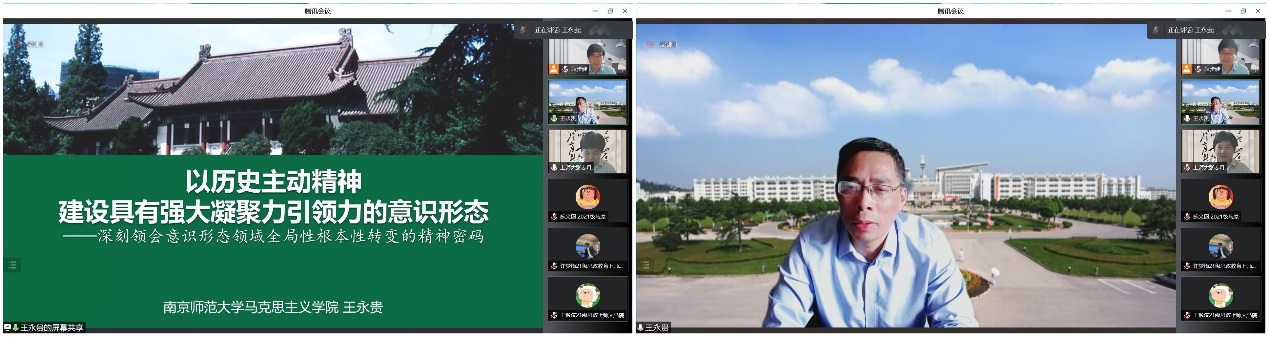 5月19日下午,beat365“思想强国”(名家讲坛系列思政选修课)第五讲通过“腾讯会议”平台举行,南京师范大学beat365唯一官网王永贵教授应邀作了题为《以历史主动精神建设具有强大凝聚力和引领力的意识形态》的讲座。此次讲座由学院副院长耿步健教授主持,院长张志丹教授总结。beat365全体师生和国内部分高校师生参加。