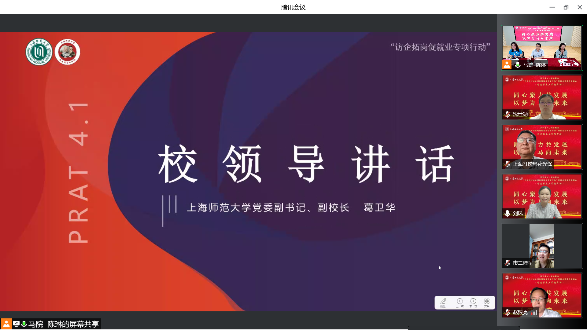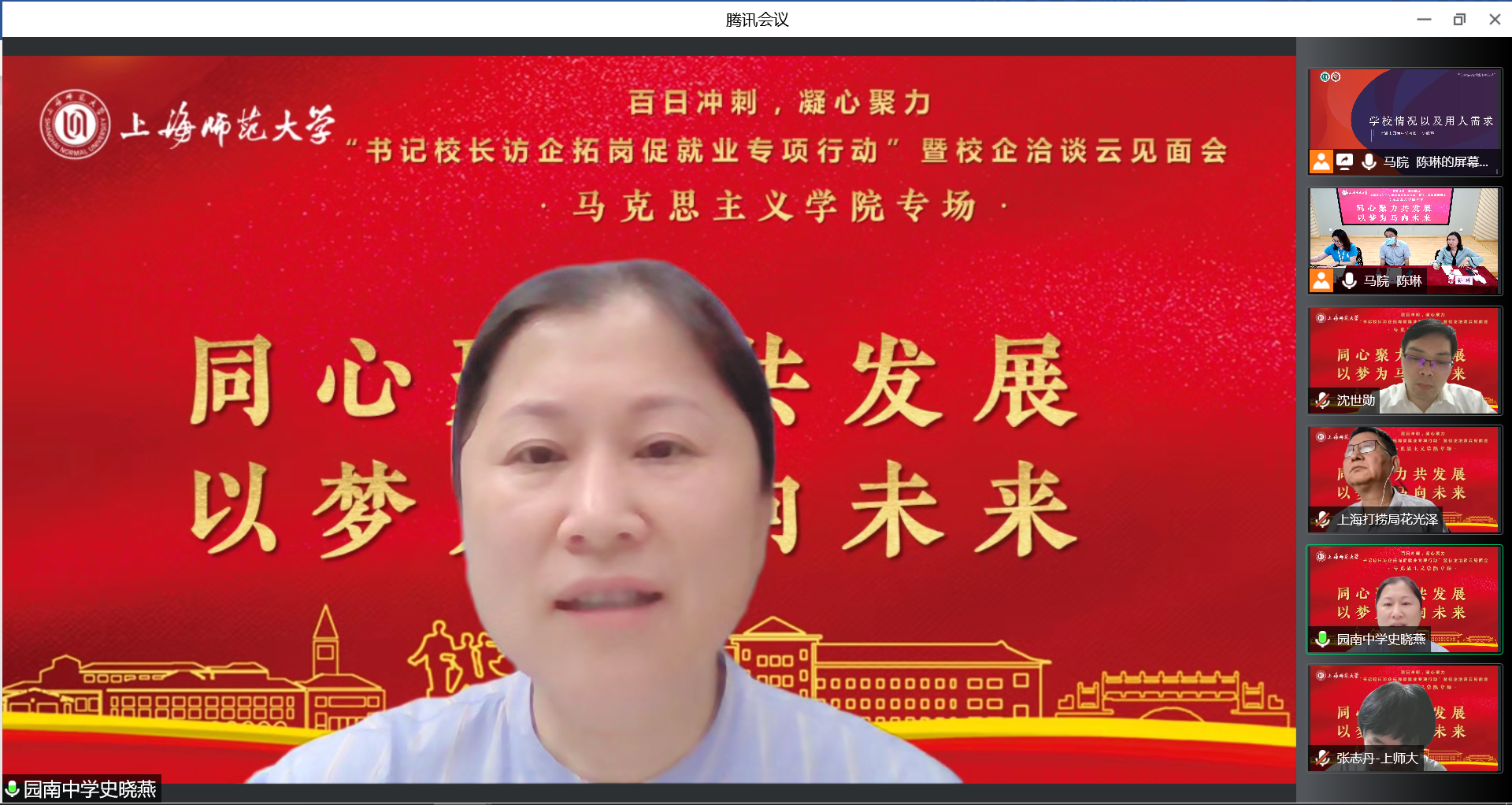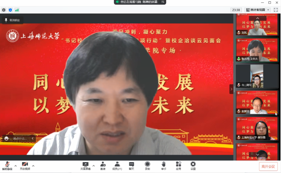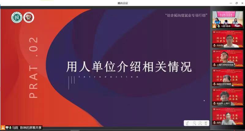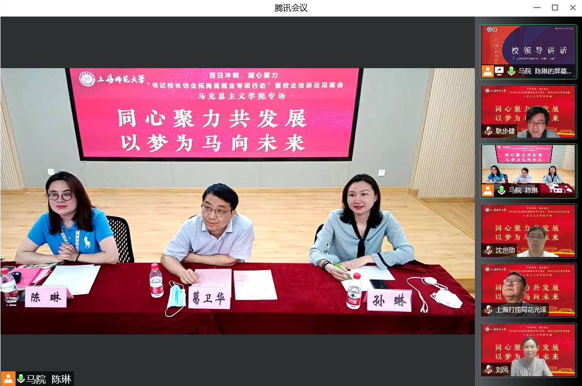 为深入贯彻落实教育部《关于开展全国高校书记校长访企拓岗促就业专项行动的通知》相关要求,6月1日晚,学院召开“书记校长访企拓岗促就业专项行动”暨校企洽谈云端见面会,并特邀上海市第二中学校长陆军,上海市园南中学校长史晓燕,上海市光明初级中学校长丁斌,上海建工二建集团纪委副书记、党建工作部主任沈世勋,交通运输部上海打捞局人事教育处处长花光泽、干部任沈震参与洽谈。校党委副书记、副校长葛卫华,校学生职业发展与就业指导中心蔡琼霞,学院党委书记刘凤,院长张志丹,党委副书记、副院长孙琳,副院长耿步健、赵银亮以及各学科、专业负责人出席会议。会议由毕业班辅导员陈琳主持。