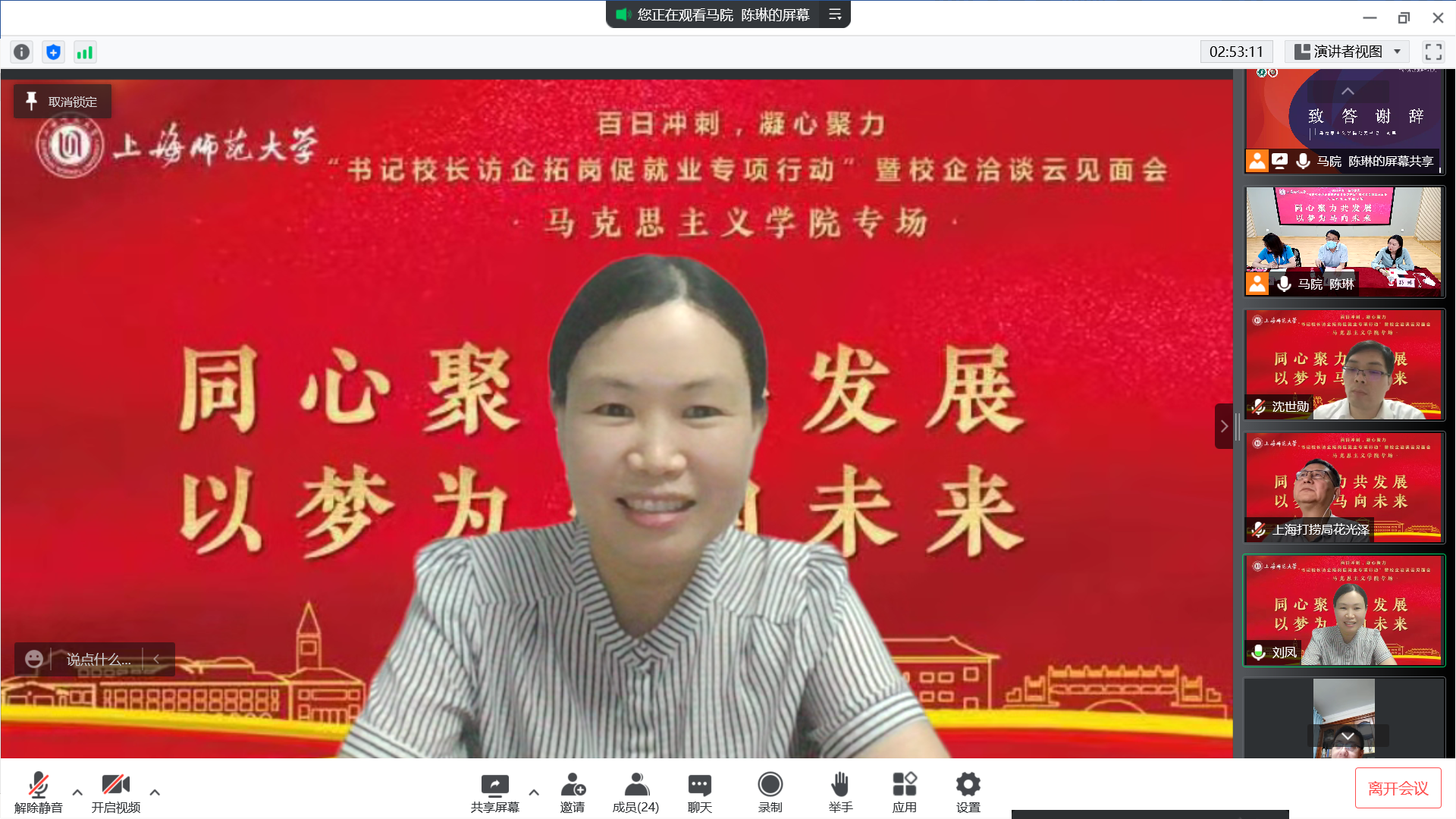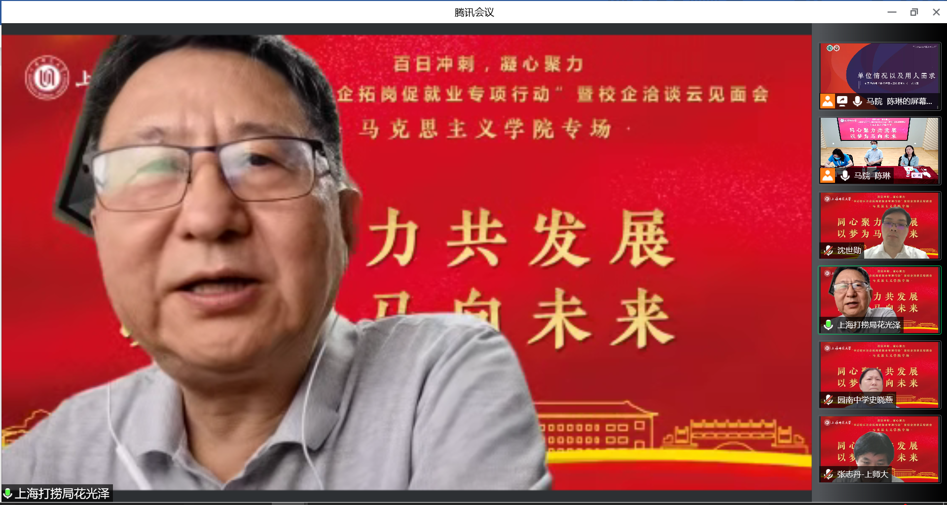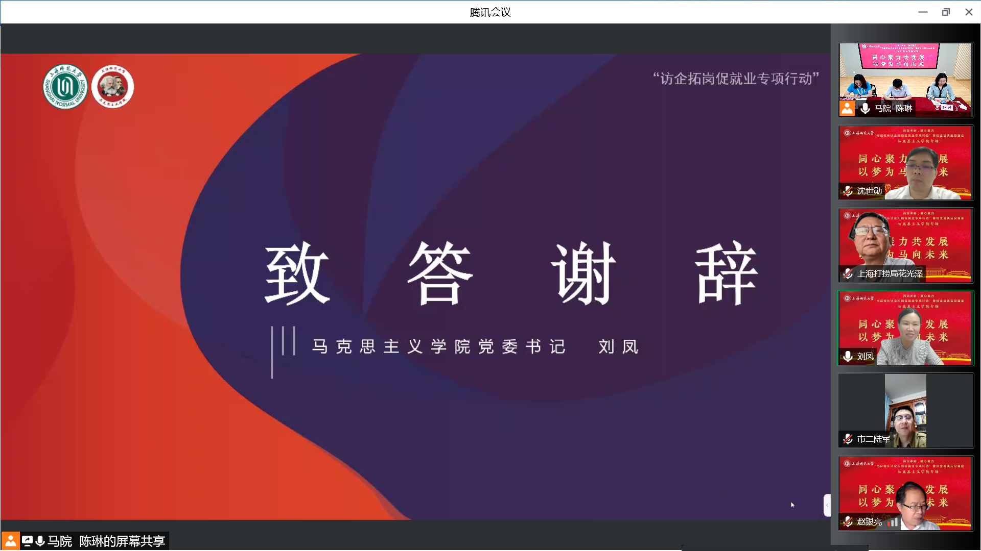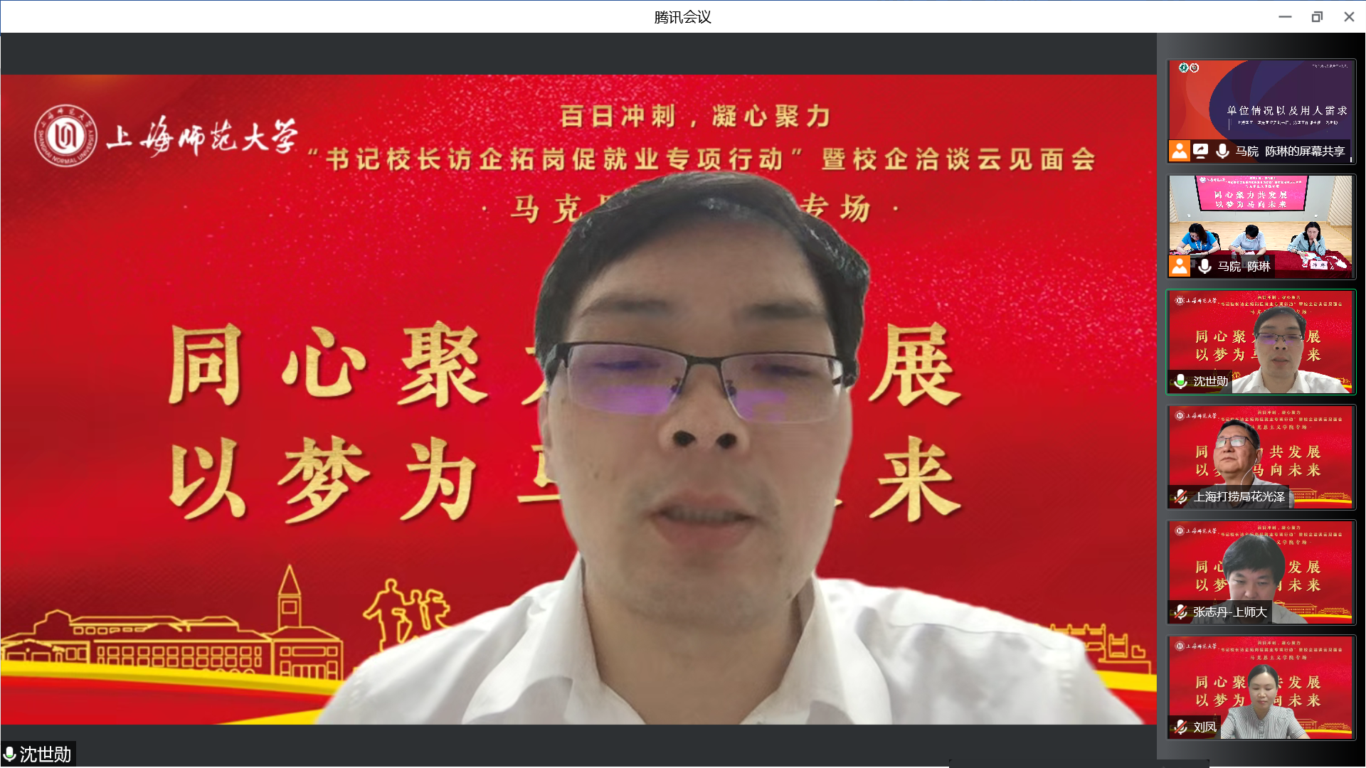 为深入贯彻落实教育部《关于开展全国高校书记校长访企拓岗促就业专项行动的通知》相关要求,6月1日晚,学院召开“书记校长访企拓岗促就业专项行动”暨校企洽谈云端见面会,并特邀上海市第二中学校长陆军,上海市园南中学校长史晓燕,上海市光明初级中学校长丁斌,上海建工二建集团纪委副书记、党建工作部主任沈世勋,交通运输部上海打捞局人事教育处处长花光泽、干部任沈震参与洽谈。校党委副书记、副校长葛卫华,校学生职业发展与就业指导中心蔡琼霞,学院党委书记刘凤,院长张志丹,党委副书记、副院长孙琳,副院长耿步健、赵银亮以及各学科、专业负责人出席会议。会议由毕业班辅导员陈琳主持。