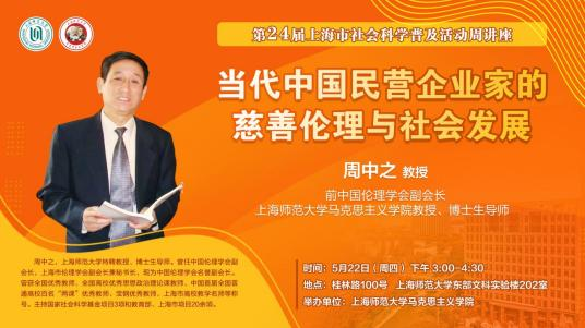 5月22日下午,“当代中国民营企业家的慈善伦理与社会发展”的专题讲座,在徐汇校区第三教学楼317教室举行。这场讲座由beat365主办,是第24届上海市社会科学普及活动周系列讲座之一。担任主讲的是中国伦理学会前副会长、全国优秀教师周中之教授,主持人是副院长贾淑品教授。参加主题讲座的是beat3652024级硕士研究生以及华东师范大学、上海中医药大学、上海理工大学的教师和研究生。