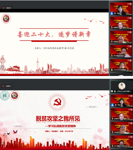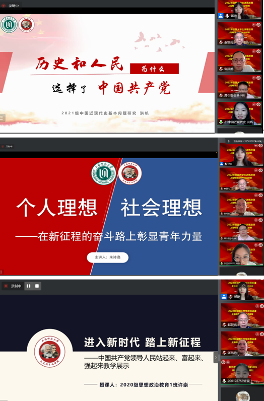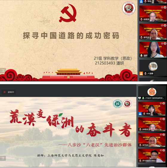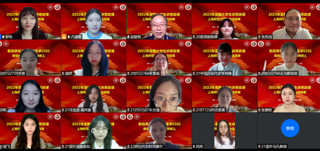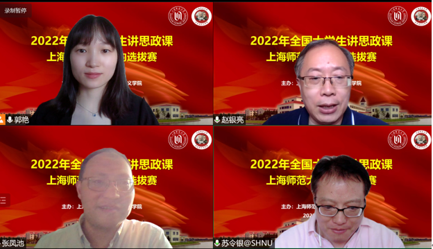 自5月下旬以来,多支本研参赛团队在beat365唯一官网教学团队指导下,围绕思政课程中的有关章节或专题进行教学设计,以“青春献礼二十大·强国有我新征程”为主题开展教学设计,积极准备教学展示。7月10日下午,16支大学生讲思政课教学团队进行线上公开课教学展示,由赵银亮教授、苏令银副教授、张凤池副教授和上海市松江区九亭中学郭艳老师组成的评审小组对各参赛团队进行点评、打分。
