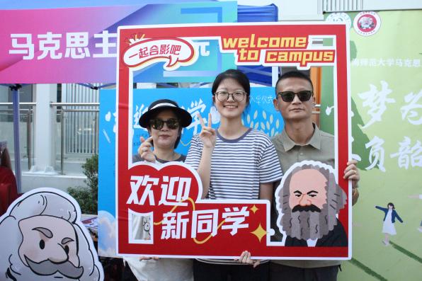 许多新生与家人在学院留影框后合影留念,镜头定格笑容,也记录下大学时代的第一帧画面。相机记录下的这一刻既是离别,更是启航。