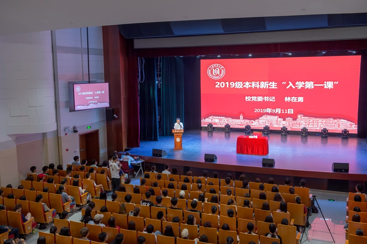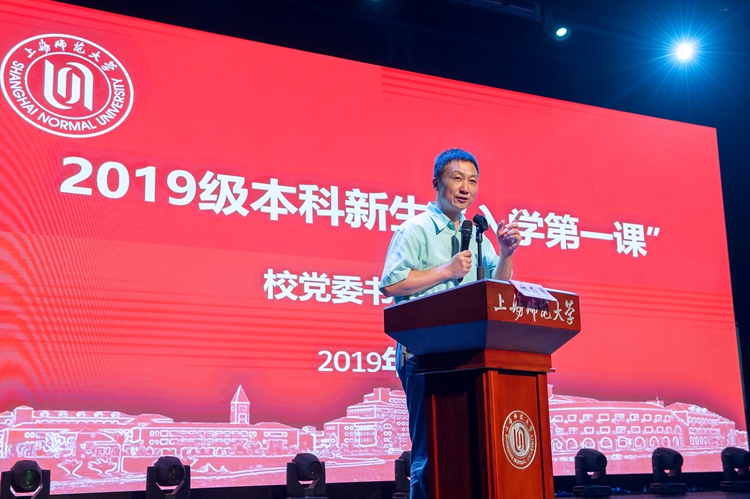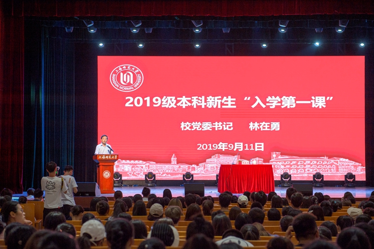 9月11日下午,beat365唯一官网2019级本科新生“入学第一课”在徐汇校区音乐厅举行。校党委书记林在勇以“选择师大,就选择了光荣”为主题,与2019级全体本科新生一起溯源师大历史、概览今日师大,畅谈人生感悟。校党委副书记、副校长葛卫华主持第一课。两校区5000多名本科新生通过现场听讲和视频直播的形式参加了学习。