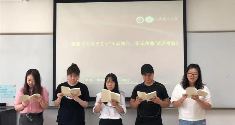 会议伊始,由2018级研究生1班党支部党员姜荔雯、杜静静共同为党员同志们朗诵了《习近平关于“不忘初心 牢记使命”论述摘编》第六章“坚持以人民为中心,把群众观点和群众路线深深植根于思想中、具体落实到行动上”中的部分讲话内容,与会党员均认真聆听、积极思索、对标讲话主旨来分析自身不足。随后,2018级研究生2班党支部党员冯博文、张琛朗诵了该书第七章“勇于自我革命,同一切影响党的先进性、弱化党的纯洁性的问题作坚决斗争”中的讲话内容。先进性和纯洁性是马克思主义政党的本质属性,我们现在组织“不忘初心 牢记使命”的专题学习交流,目的也在于加强我党建设,同一切弱化党的先进性、损害党的纯洁性的问题作斗争,坚决祛病疗伤、激浊扬清。最后,2018级研究生3班党支部全体党员为党员同志们朗诵了该书第十章的部分“新时代要有新气象,更要有新作为”,令党员同志们充分感受到了新时代历史定位的重要意义和我党砥砺奋进的坚定信心。