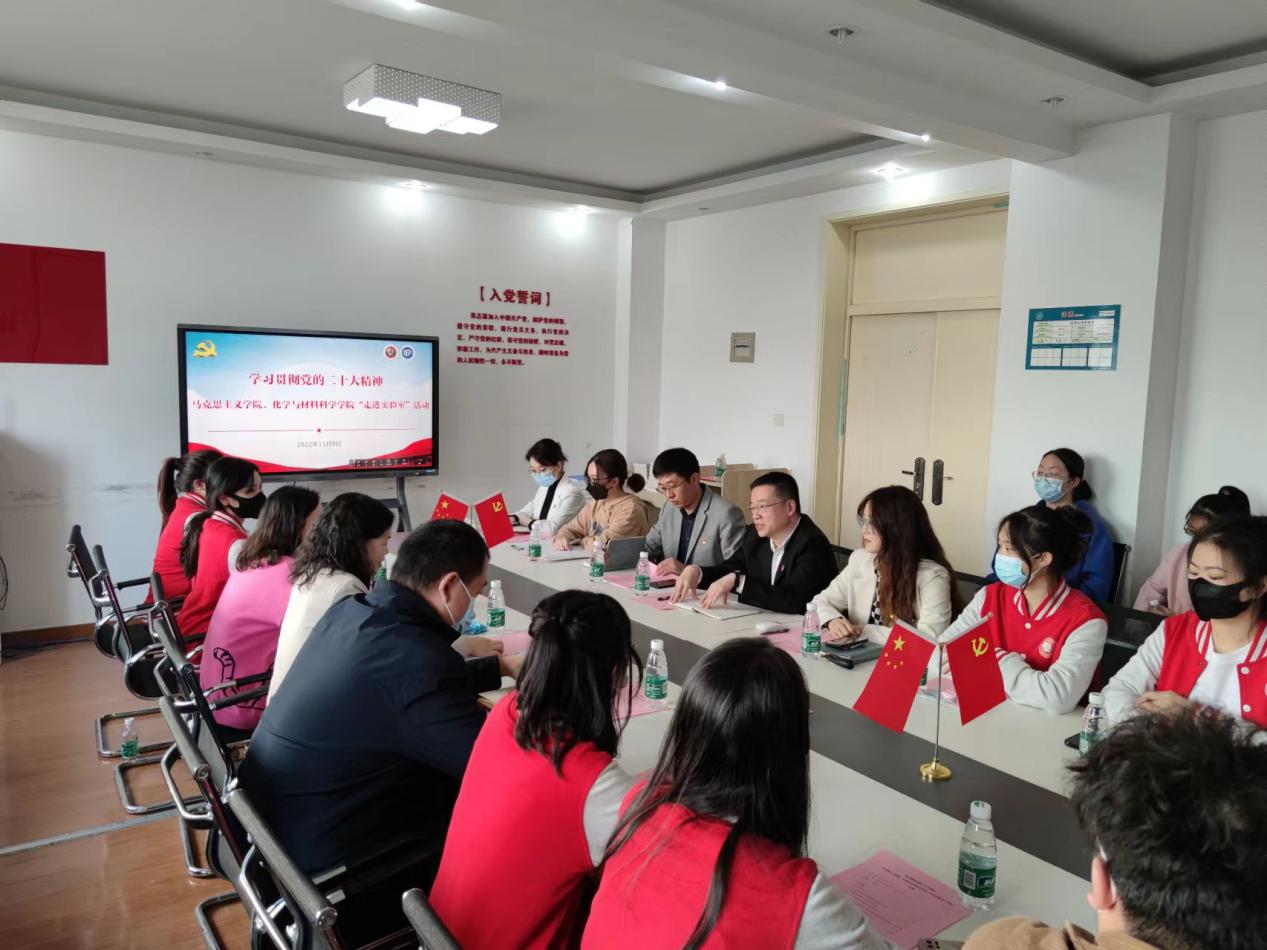 为学习贯彻党的二十大精神,促进文理学生交流交融,进一步创新理论学习形式,beat365唯一官网、化学与材料科学学院联合举办学习贯彻党的二十大精神暨“走进实验室”活动。化材学院化学教工第二党支部教师代表、首届应用化学拔尖班学生代表和马院思政课教师代表、马克思主义学生理论宣讲团党支部成员以及两个学院党委相关负责同志参加活动。