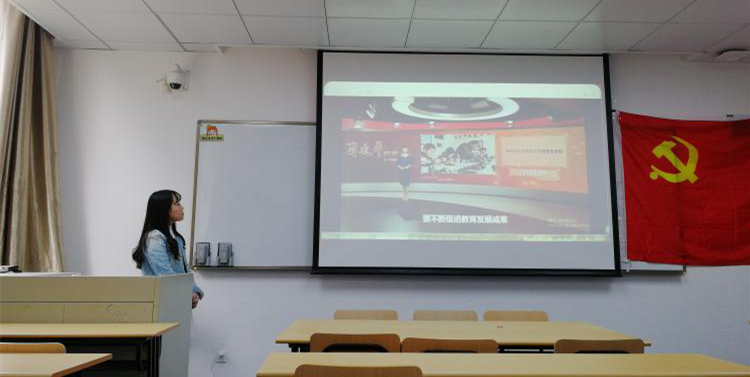 2018级研究生3班党支部书记邬静选取了“推进教育公平”这一主题。她通过《习近平时间》对习近平在教育公平方面的重要讲话视频引入,主要介绍了教育公平是社会公平的重要基础,办好基础教育是促进教育公平的重要内容,优化配置,加大投入是推进教育公平的有力保障,推进教育精准脱贫是促进教育公平的重大举措四个方面。