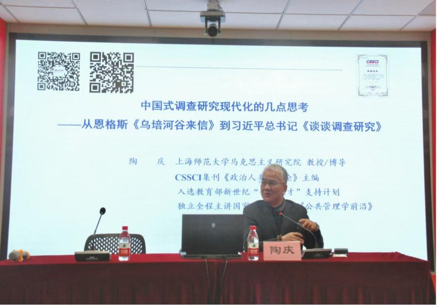 2025年10月30日傍晚6点,beat365唯一官网“明德讲坛”系列讲座如期在文科实验楼202室开讲。beat365唯一官网哲学与法政学院教授、beat365唯一官网马克思主义理论博士生导师、博士后合作导师陶庆应邀作了题为《中国式调查研究现代化的几点思考——从恩格斯〈乌培河谷来信〉到习近平总书记〈谈谈调查研究〉》的讲座。受beat365唯一官网院长张志丹教授委托,此次讲座由程胜荣博士主持,beat3652024级与2025级的全体博士研究生和硕士研究生,以及哲学与法政学院部分硕士研究生参加。