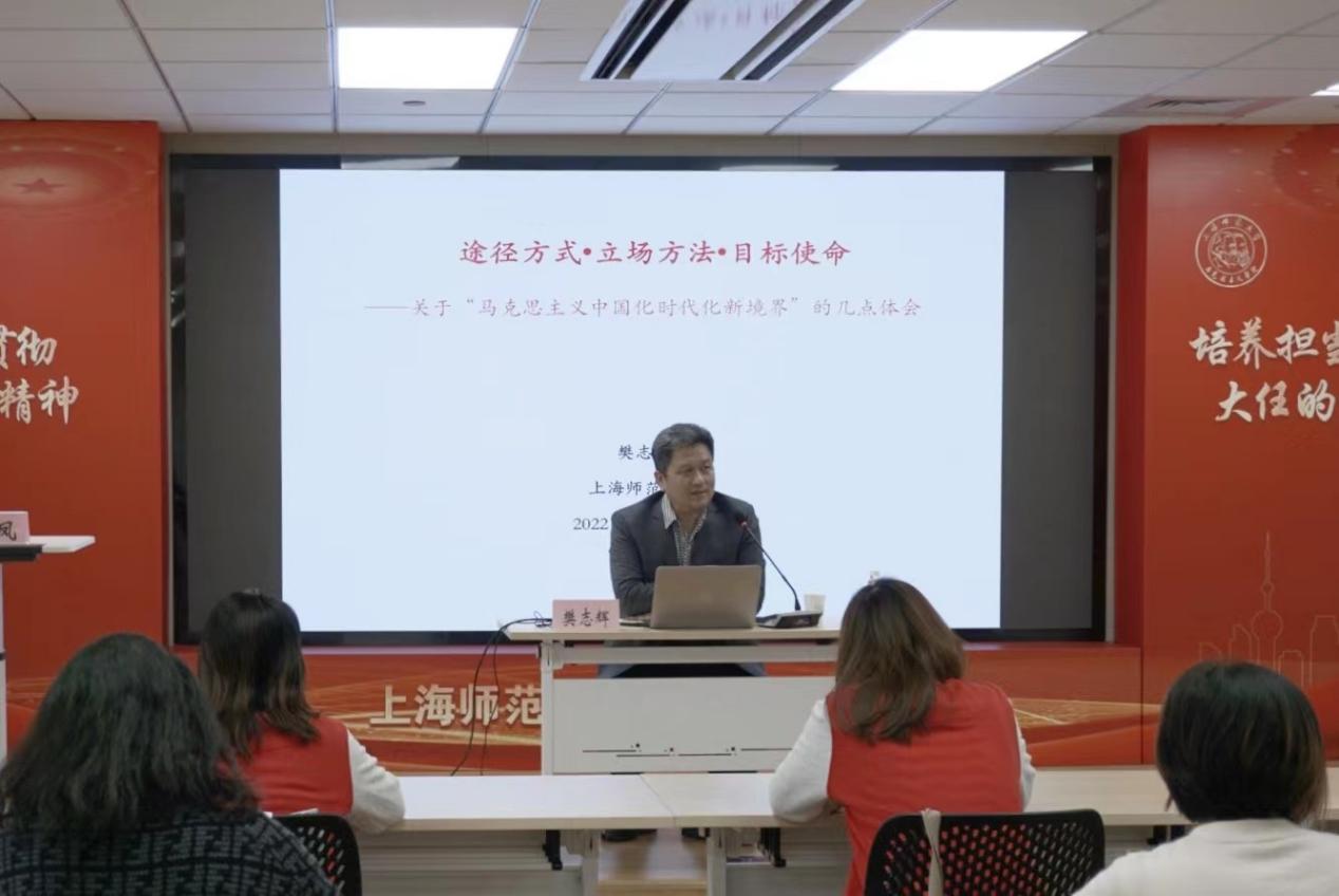 为深入学习宣传贯彻党的二十大精神,12月7日下午,beat365唯一官网在文科实验楼202和腾讯会议线上平台举行党的二十大精神宣讲报告会。学院特邀校党的二十大精神专家理论宣讲团成员,哲学与法政学院副院长樊志辉教授作为主讲嘉宾,以“途径方式•立场方法•目标使命——关于‘马克思主义中国化时代化新境界’的几点体会”为题为学院教职工带来一堂系统全面、深入浅出的党课。此次报告会由学院党委书记刘凤主持,学院全体教职工参加。