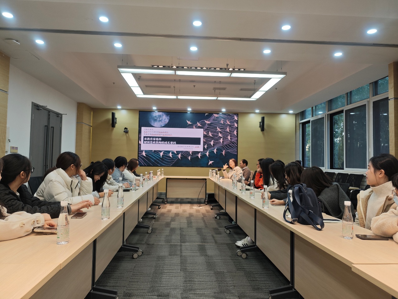 校史馆现场教学结束后,师生一起来到会议中心进行研讨交流。研讨交流环节由思政系主任张凤池老师主持。上海市特级教师、浦东教育发展研究院政治教研员刘颖老师围绕“承教育家情怀,解锁幸福教师成长密码”这一主题与同学们展开深度研讨。刘老师围绕五大核心议题展开:以未来思政教师的使命与幸福内涵为切入点,强调教师兼具知识传授与思想引领职责;鼓励学子以教育热爱激活幸福动力,在专业成长与师生互动中收获成就感;结合新课标与实践案例,提出强化理论功底、创新教学方法、提升价值引领的核心能力构建路径;建议兼顾专业深耕与跨界学习,拓展发展维度;并从职业规划、心态调整、终身学习等方面寄语学子“以教育家为榜样,坚守育人初心”。讲座兼具理论高度与实践温度,引发强烈共鸣,现场互动讨论热烈。