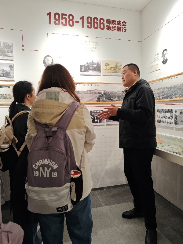 在校史馆的现场教学中,“校史馆里的思政课”教学团队成员向同学们动情讲述名师大家的故事,让“师道永恒”的师大精神变得亲切,让“中国特有的教育家精神”变得具象化。张彬老师结合我校首任校长廖世承先生的事迹,为在场学生阐释了“心有大我、至诚报国的理想信念”;陈昱颖老师讲述了老校长杨德广献身高等教育事业的事迹,引导青年学生学习他“言为士则,行为世范的奉献精神”;陈晓静老师为大家讲述了篮坛泰斗李震中老师的传奇故事,在体育报国的人生经历中饱含“启智润心、因材施教的育人智慧”;许心老师带来“80后”教师傅欣援藏的经历,让同学们看到师道永恒的精神文脉中体现的是“胸怀天下、以文化人的弘道追求”;郝凤老师讲述了我校贺宝根烈士舍己救人的事迹,让学生感受到了“乐教爱生、甘于奉献的仁爱之心”。