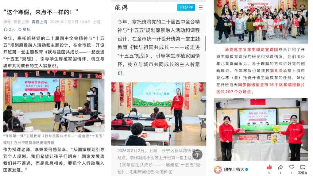 2月2日,2026年上海市小学生爱心寒托班正式开班,全市16个区和临港新片区共297个办班点集体开展开班主题教育《我与祖国共成长:一起走进“十五五”规划》,引导学生厚植家国情怀,树立与城市共同成长的主人翁意识。