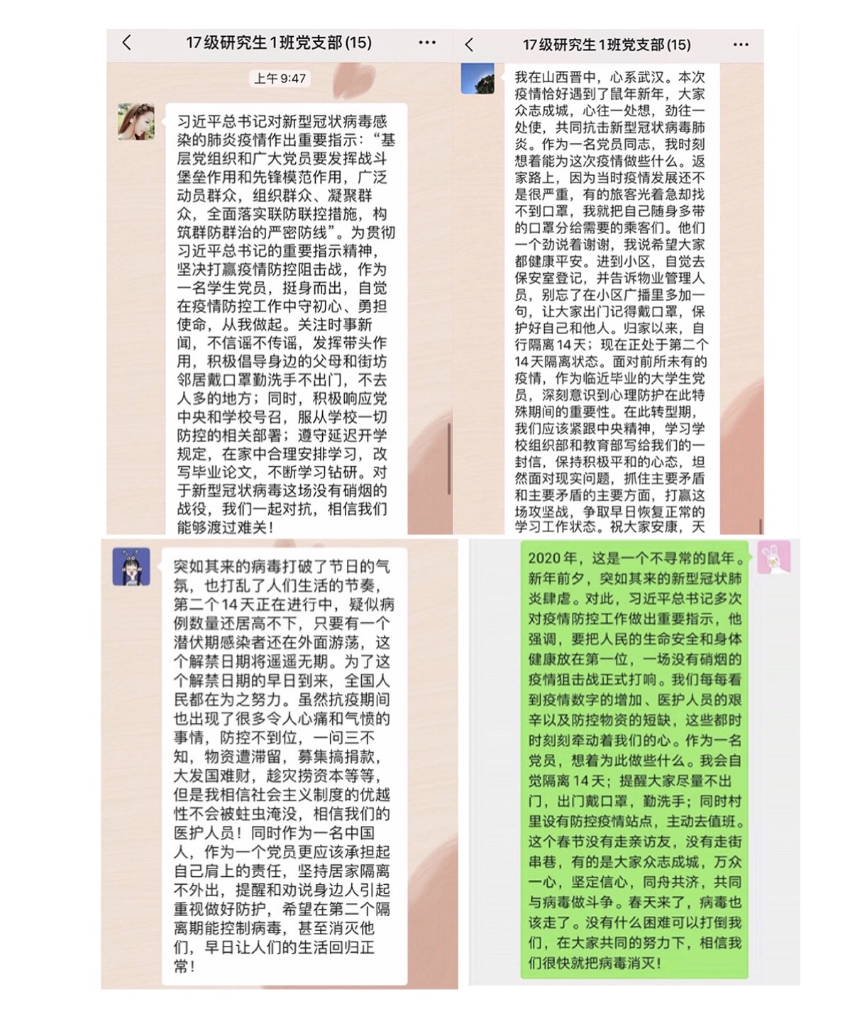 2020年2月10日,2017级研究生1班党支部就此次科学精准打赢疫情防控阻击战进行了线上集中学习,由党支部书记陈红斌主持,先后学习了《习近平总书记关于疫情工作的重要讲话》和《beat365唯一官网致全校各级党组织和全体共产党员的信》。