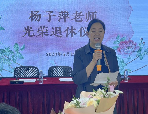 荣休仪式上,学院领导为杨子萍老师颁发光荣退休证书和鲜花。